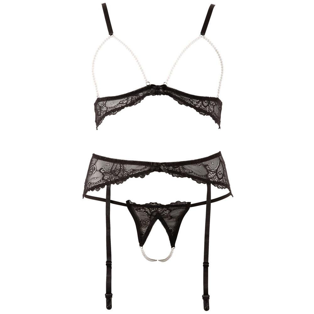 Lace set that contains a wireless bra, crotchless string and a suspender belt. The pearls accentuate the naked breasts and open crotch area, very feminine but it also gets to the point. The bra and suspender straps can be adjusted.
