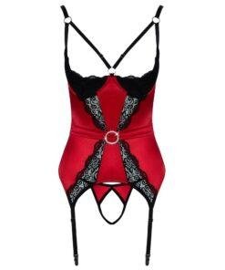 Demi cup cami suspenders and a crotchless thong from Cottelli LINGERIE in a set. Made of stretchy red satin and adorned with delicate lace and contrasting elements in black. Super soft and stretchy for high comfort. The incorporated balcony bra is padded and puts the breasts in the limelight and is perfectly framed and supported by the cup’s straps and underwire. Shimmering rhinestone rings between the cups and at the front of the waistband complete the package. The straps and suspenders are very elastic and can be adjusted to fit. The back of the cami suspenders features a row of hook fasteners and the matching thong is invitingly open in the crotch.