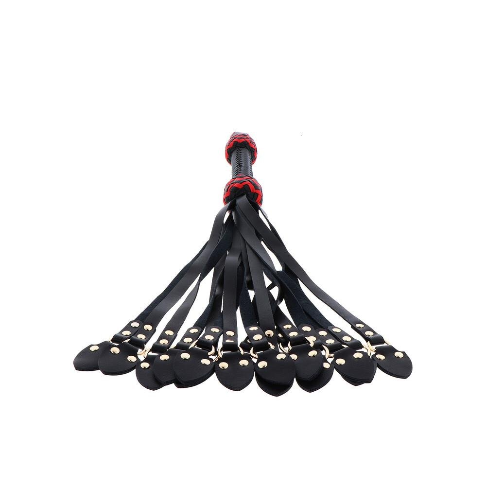 Each whip is meticulously crafted with multiple tails, ensuring a unique combination of intensity and effect. The braided handle, accented in red, not only enhances its striking appearance but also provides a secure grip for confident handling.